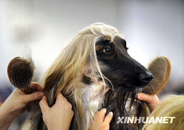 10月17日,在德國多特蒙德舉行的狗和馬動物節(jié)上,人們給一只阿富汗獵犬梳理毛發(fā)。這次的動物節(jié)有來自世界各地大約8000只純種狗參加10月17日到19日舉行的比賽,預計觀眾將達到75000人。新華社/法新
