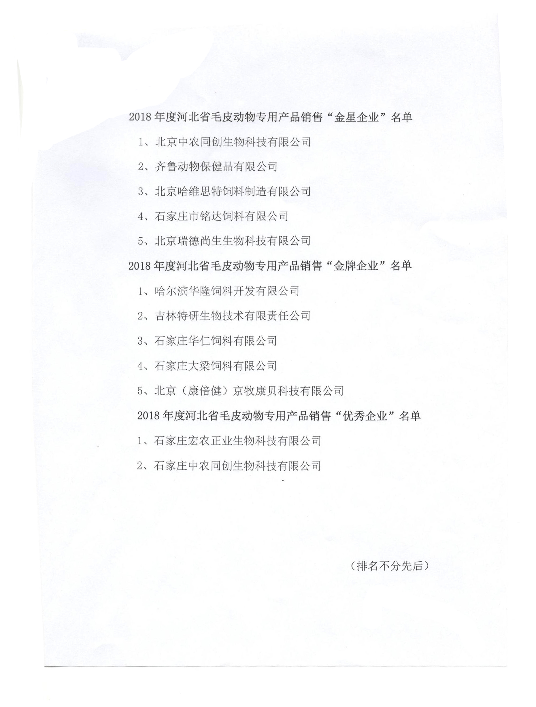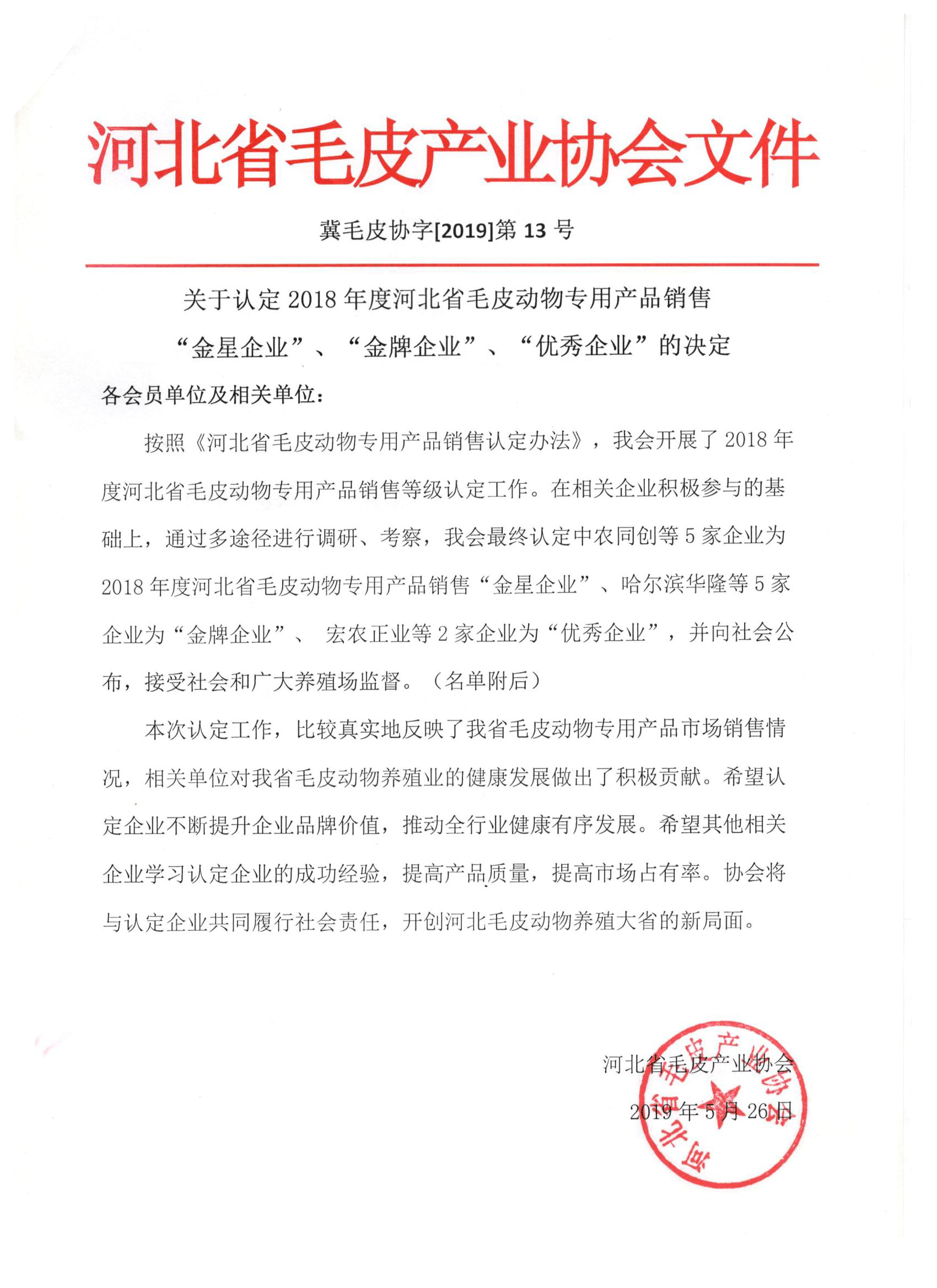 關(guān)于認(rèn)定2018年度河北省毛皮動(dòng)物專用產(chǎn)品銷售 “金星企業(yè)”、“金牌企業(yè)”、“優(yōu)秀企業(yè)”的決定