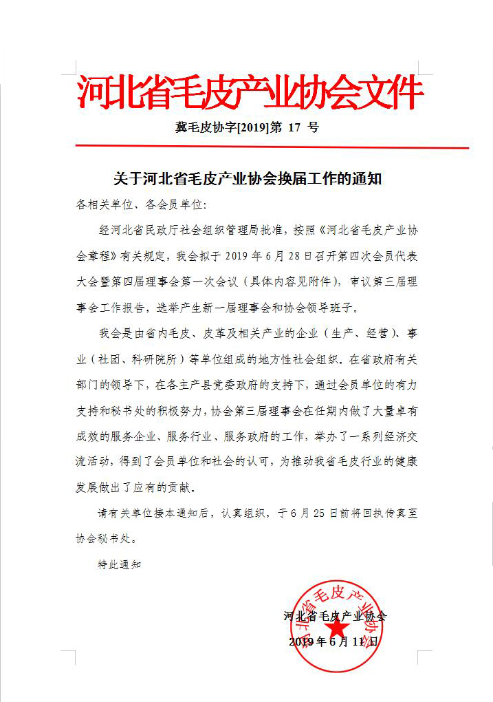 關(guān)于河北省毛皮產(chǎn)業(yè)協(xié)會換屆工作的通知
