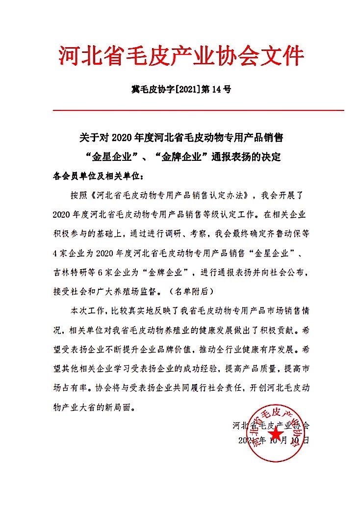 關(guān)于對2020年度河北省毛皮動物專用產(chǎn)品銷售“金星企業(yè)”、“金牌企業(yè)”通報表揚(yáng)的決定