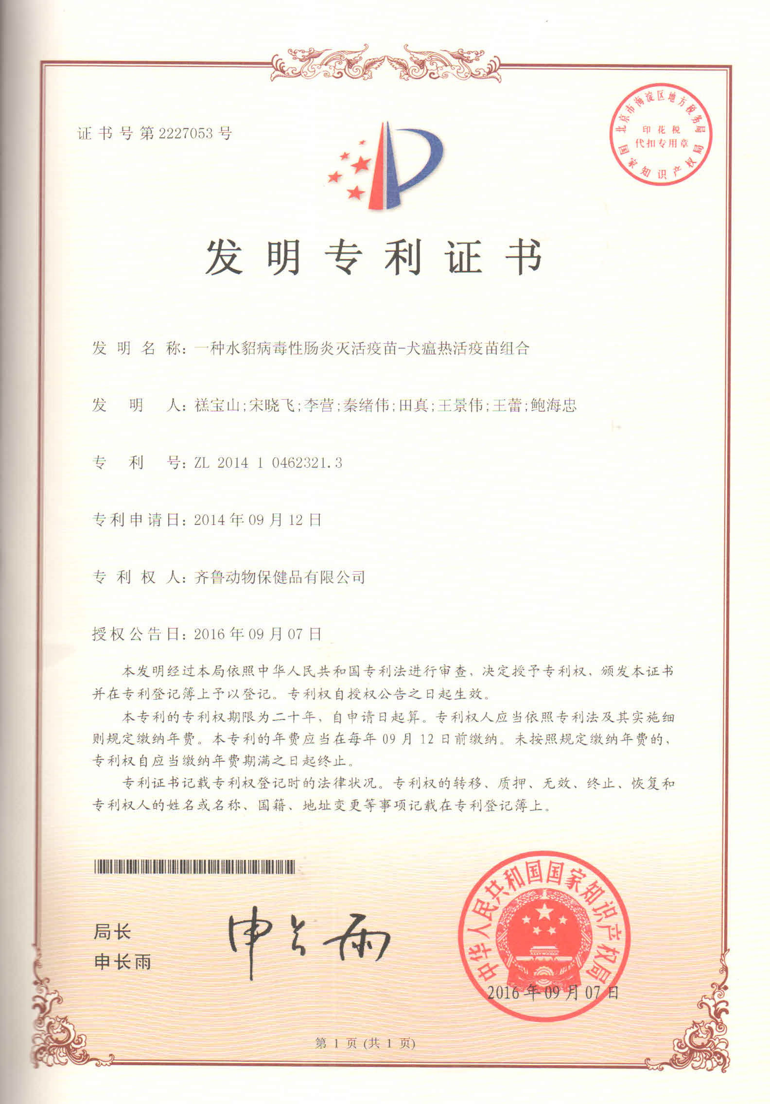 一、 我公司專業(yè)從事疫苗研發(fā)、生產(chǎn)、銷售60余年,擁有國(guó)家知識(shí)產(chǎn)權(quán)局授予的國(guó)家專利20余項(xiàng)。“一種水貂病毒性腸炎滅活疫苗-犬瘟熱活疫苗組合”(犬瘟熱腸炎一針兩防)是我公司自主研制開(kāi)發(fā)的專利產(chǎn)品,已獲得國(guó)家知識(shí)產(chǎn)權(quán)局頒發(fā)的發(fā)明專利證書,證書號(hào):第2227053號(hào);專利號(hào): ZL 2014 1 0462321.3。 任何公司、個(gè)人或其他組織,不得仿制或仿冒產(chǎn)品侵害我公司產(chǎn)品專利權(quán)。