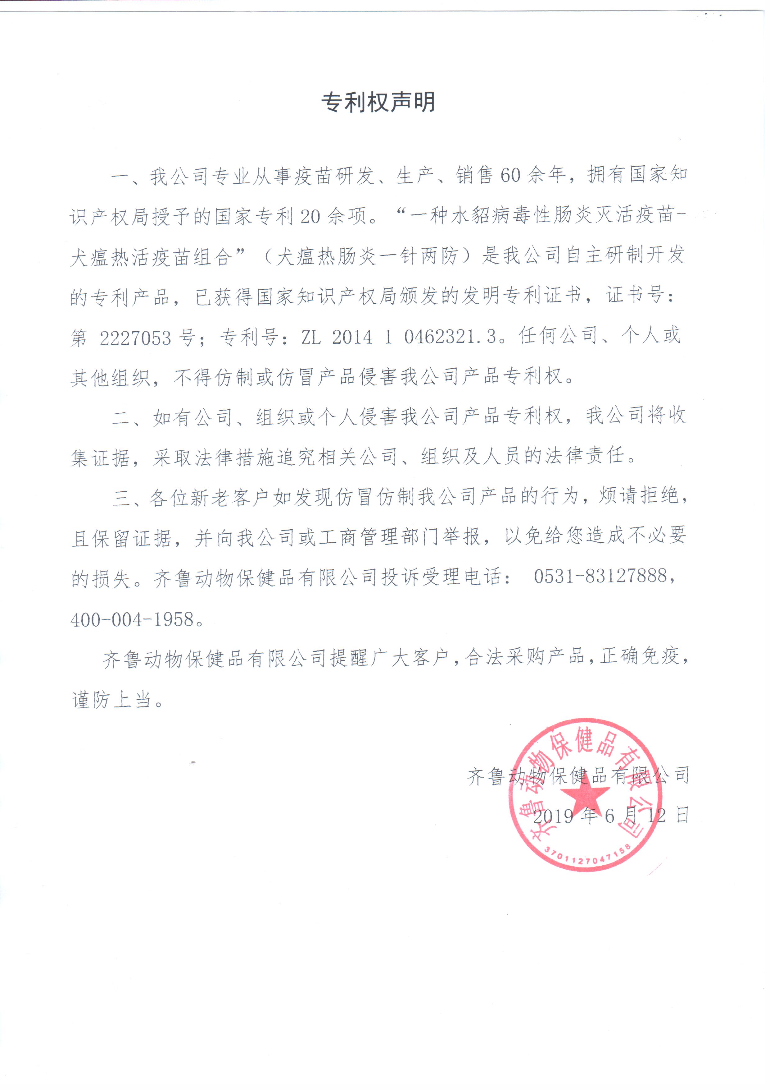 齊魯動(dòng)物保健品有限公司專利權(quán)聲明