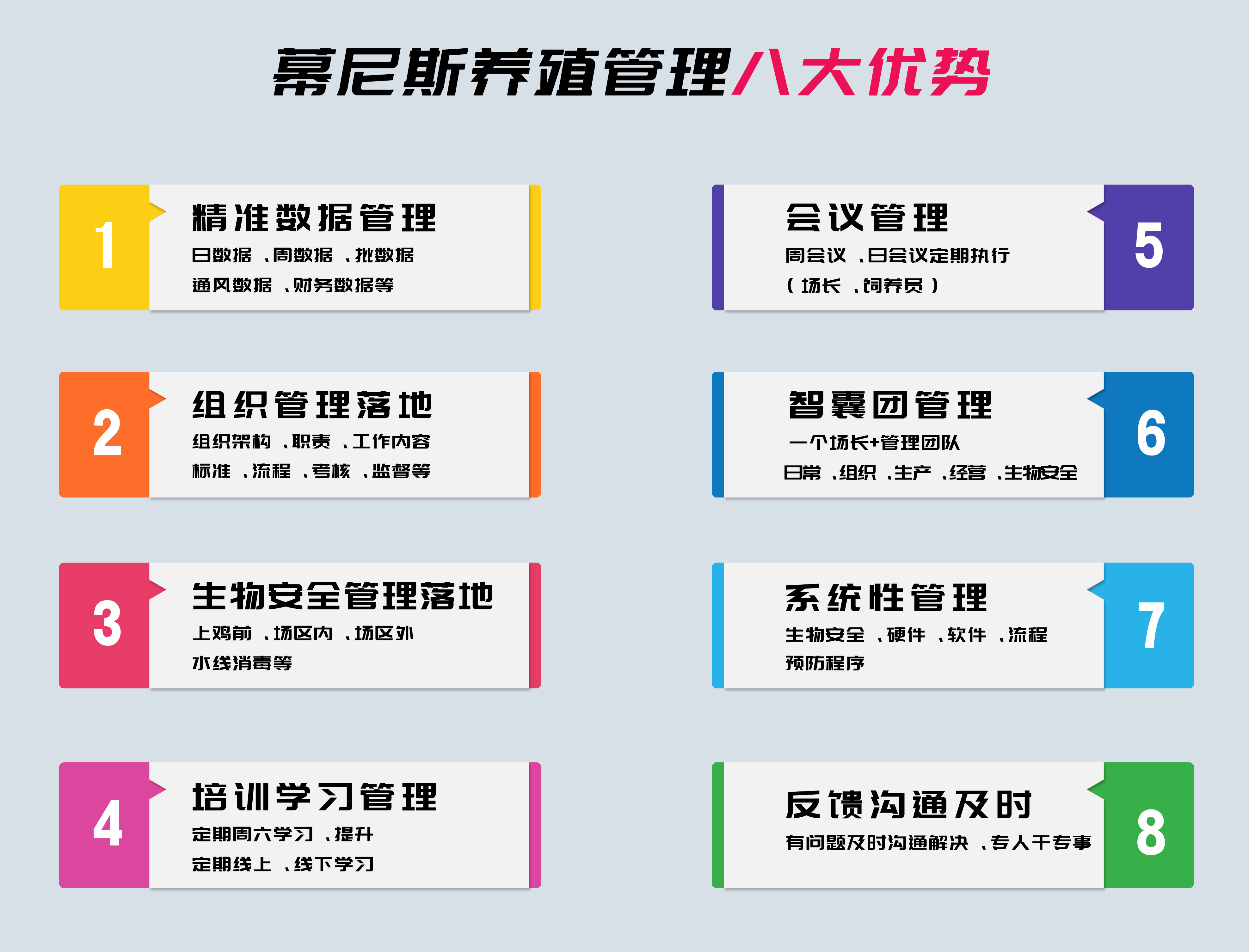 公司成立以來(lái),以科技為本,堅(jiān)持理論聯(lián)系實(shí)際,秉承“做精細(xì)化管理,創(chuàng)養(yǎng)殖高效益”的經(jīng)營(yíng)理念。通過(guò)對(duì)規(guī)?;B(yǎng)殖場(chǎng)提供系統(tǒng)管理,開創(chuàng)了精細(xì)化1258管理系統(tǒng),精細(xì)化36524操作流程,精細(xì)化37112保健方案,被業(yè)內(nèi)同仁稱為“幕尼斯精細(xì)化管理模式”。