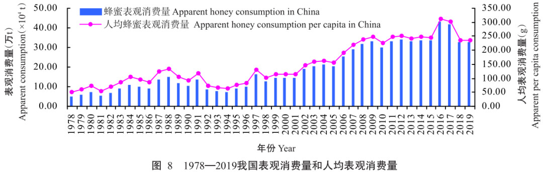 1988—1997年我國進口蜂蜜價格波動較大,單價為403.59~5000.00美元/噸,1997—2009年,我國進口蜂蜜價格和全球進口蜂蜜價格相差不大,在2000美元/噸上下波動,2009年后我國進口蜂蜜價格直線上升,而全球蜂蜜進口價格維持在3000美元/噸左右,2017年我國進口蜂蜜價格約是全球蜂蜜進口價格的5倍,到2018年,我國進口蜂蜜價格達到改革開放后最高值18325.05美元/噸。1978—2019年,我國出口蜂蜜價格一直低于全球蜂蜜出口價格,1995年前我國蜂蜜出口價格一直低于1000.00美元/噸,在800.00美元/噸上下波動,1995—2005年則在1000.00美元/噸上下波動,2005年后開始慢慢上升,2011年后,我國出口蜂蜜價格基本維持在2000.00美元/噸。2009年后我國蜂蜜進口價格快速上升,我國蜂蜜進口價格遠高于我國蜂蜜出口價格,而全球蜂蜜進出口價格基本持平。4我國蜂蜜表觀消費量和人均表觀消費量走勢分析
