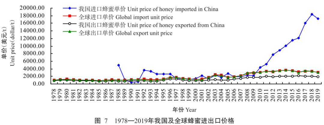 改革開放以來,我國一直是全球蜂蜜主要出口國之一。1978—2019年我國蜂蜜出口量及其占全球蜂蜜出口量比例波動較大,說明我國蜂蜜出口市場極不穩(wěn)定,尤其2015年之后,我國蜂蜜出口量及其國際市場占有率均呈下降趨勢,說明我國蜂蜜出口前景不容樂觀。1978—2019年我國蜂蜜出口RCA指數總體呈顯著下降趨勢,在此期間,RCA指數具有波動性,1979—1997年,總體呈快速下降趨勢,說明在此期間我國蜂蜜出口國際競爭力逐漸下降,1998—2001年RCA指數保持平穩(wěn),1978—2001年RCA指數均在4.33以上,說明我國蜂蜜出口具有比較優(yōu)勢,2002年以后RCA指數下降減緩,趨于平穩(wěn),但2014、2015及2017年之后RCA指數均在1.00以下,說明我國蜂蜜國際市場已經沒有競爭優(yōu)勢,處于劣勢地位。3.2我國蜂蜜主要進口國和出口國我國蜂蜜進口以滿足高端消費市場為主,主要選擇國際知名度高、質量有保證、蜜源地環(huán)境好的品牌蜂蜜,2019年我國蜂蜜進口國主要為新西蘭、澳大利亞、泰國和俄羅斯等,其中,新西蘭是我國蜂蜜最主要進口國,約占全國蜂蜜進口的40.00%;2019年我國蜂蜜主要出口國家為歐盟國家和日本,其中以英國和日本為主,兩者約占我國蜂蜜出口量的一半。我國蜂蜜出口市場太過依賴于歐盟和日本市場,一旦雙邊產生貿易摩擦或增加貿易壁壘,我國蜂蜜出口將產生巨大影響,其他國際市場有待我國蜂蜜出口企業(yè)去開發(fā)。3.3我國進出口蜂蜜價格走勢及分析