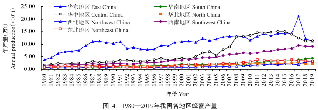 我國蜂蜜產量在全球所占比例變化趨勢及我國蜂蜜平均每群產量變化趨勢與我國蜂蜜產量變化趨勢基本相似,1978—2016年我國蜂蜜產量所占全球比例具有一定波動性,總體上逐步上升。1978—2019我國蜂蜜平均每群產量和總體增長速度均高于全球蜂蜜平均每群產量,2019年我國蜂蜜平均每群產量是全球蜂蜜平均每群產量的2.49倍。2009年后,我國蜂群數量增長速度放緩,但我國蜂蜜平均每群產量仍然保持一定的增長趨勢。2蜂蜜產區(qū)分布及走勢分析