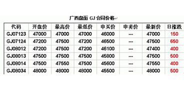 今日廣西盤面GJ與生絲合同再度走出分化行情。GJ合同齊漲,且有價無市的觀望心態(tài)十分明顯,SS合同則大部下跌,遠(yuǎn)周SS08034合同再度跌至17萬的整數(shù)價位。 廣西盤面GJ成交量