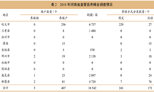 注:養(yǎng)殖場為養(yǎng)殖規(guī)模大,有固定養(yǎng)殖場所,以單位形式經(jīng)營;養(yǎng)殖戶為以個人或家庭為主,養(yǎng)殖規(guī)模小,以個體形式經(jīng)營;固定養(yǎng)殖方式為固定在某地養(yǎng)殖,多為養(yǎng)殖場和養(yǎng)殖戶大戶;流動方式為受花期、季節(jié)等因素影響,轉(zhuǎn)地養(yǎng)殖,多為養(yǎng)殖戶。