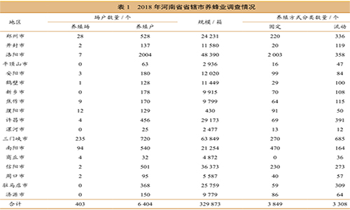我國是全球第一養(yǎng)蜂大國,蜂群規(guī)模大,蜂蜜、蜂王漿、蜂膠等蜂產(chǎn)品產(chǎn)量均居世界首位。養(yǎng)蜂業(yè)也是農(nóng)業(yè)的重要組成部分,對于促進農(nóng)民增收、提高農(nóng)作物產(chǎn)量和維護生態(tài)平衡具有重要意義。為加強對養(yǎng)蜂業(yè)發(fā)展的管理與指導(dǎo),推動產(chǎn)業(yè)持續(xù)健康穩(wěn)定發(fā)展,結(jié)合養(yǎng)蜂業(yè)發(fā)展實際,農(nóng)業(yè)部編制了《全國養(yǎng)蜂業(yè)”十二五"發(fā)展規(guī)劃》, 這是我國首次將養(yǎng)蜂業(yè)列入”五年規(guī)劃"。為了解河南省養(yǎng)蜂業(yè)的生產(chǎn)管理現(xiàn)狀,保障蜂產(chǎn)品質(zhì)量安全, 2018年對全省18個省轄市和10個省直管縣開展了調(diào)研。