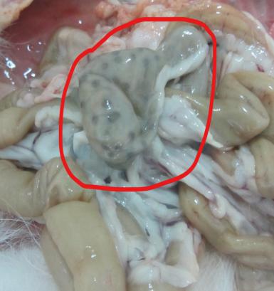 肝臟腫大出血或輕微發(fā)黃;脾臟腫大,表面及邊緣有出血點;胃粘膜脫落,胃底出血;腸壁變薄,空腸和回腸可見大量的球蟲結(jié)節(jié),呈圓餅狀或帶狀;盲腸有密密麻麻的潰瘍灶,病程嚴(yán)重的直腸有潰瘍灶;胃腸道內(nèi)容物呈黑褐色。