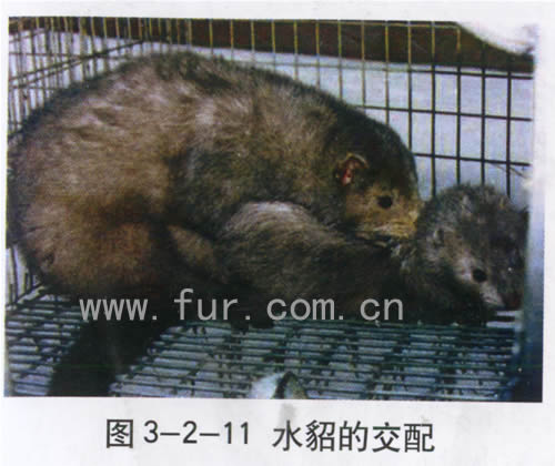 放對(duì)方法:將母貂抓至公貂籠門前,來回逗引,如果公貂有求偶表現(xiàn),發(fā)出“咕咕”叫聲,即打開籠門,將母貂頭頸部送入籠內(nèi),待公貂叼住母貂頸背部后,將母貂順手放于公貂腹下,關(guān)好圖3—2—11水貂的交配