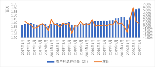 5月份,監(jiān)測(cè)企業(yè)在產(chǎn)種鴿存欄量約為159萬(wàn)只,環(huán)比增長(zhǎng)0.76%,增速放緩,但與近年同期相比,該增速依然表現(xiàn)最好。自2月份開始,產(chǎn)鴿產(chǎn)能因?yàn)槎喾N原因已經(jīng)連續(xù)增長(zhǎng)了4個(gè)月。從結(jié)構(gòu)上看,本月份監(jiān)測(cè)企業(yè)產(chǎn)能未出現(xiàn)減產(chǎn)現(xiàn)象。