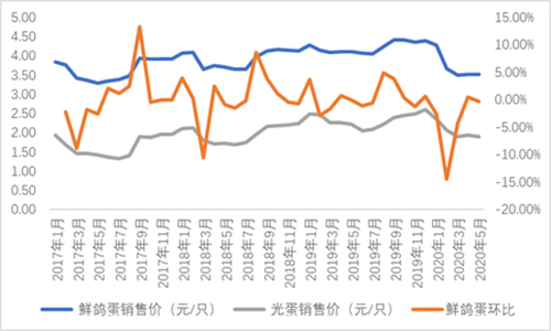 5月份,監(jiān)測(cè)企業(yè)鴿蛋價(jià)格維持在3.5元/只的平均水平。低的地區(qū)售價(jià)僅有1.5元/只,但也沒有進(jìn)一步下滑;多數(shù)企業(yè)售價(jià)在平均值以下。價(jià)格高的企業(yè)鮮蛋售價(jià)在6元/只,為少量的包裝零售價(jià)格,不代表多數(shù)。光蛋的價(jià)格也有所下調(diào),一些地方下行到1元/只附近。受整體蛋價(jià)低迷的影響,鴿蛋價(jià)格短期下行可能性較大。