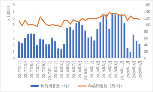5月份,監(jiān)測(cè)企業(yè)種鴿銷量環(huán)比下降18%,而近年同期一般為增長(zhǎng)階段,表明市場(chǎng)的引種積極性仍有所下調(diào)。從結(jié)構(gòu)上看,僅有極少數(shù)企業(yè)的銷量有所回升,多數(shù)不銷售或少銷售。價(jià)格以下調(diào)為主,最低價(jià)格下調(diào)到34元/對(duì),但高的有200元/對(duì),這種價(jià)差主要是日齡的原因,由養(yǎng)殖場(chǎng)根據(jù)客戶需要定制??傮w來(lái)看,5月份種鴿銷售量?jī)r(jià)齊跌。