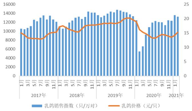 1、2月份乳鴿銷量指數(shù)(萬(wàn)對(duì)產(chǎn)鴿的乳鴿銷售數(shù))分別為13609和13232,環(huán)比分別增加10.54%和-2.77%。從結(jié)構(gòu)性看,1、2月份乳鴿銷量均有增有減,各地差異較大。另外,本期1-2月乳鴿銷量指數(shù)與2019年相當(dāng),并明顯好于2017以來(lái)的其他年份。價(jià)格方面,1-2月份,乳鴿價(jià)格環(huán)比增加4%和8%,2月份監(jiān)測(cè)企業(yè)的價(jià)格區(qū)間提升至11-20元/只,平均價(jià)格為15元/只,但與往年同期相比仍處于較低水平。