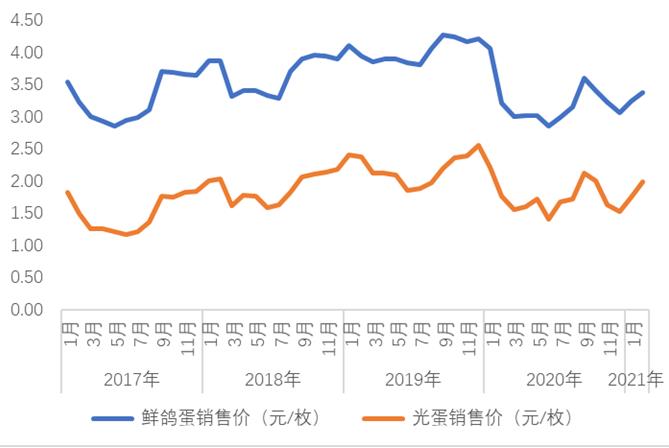 1-2月份,監(jiān)測(cè)企業(yè)鴿蛋價(jià)格環(huán)比分別增加6%和4%,其中2月份鴿蛋平均價(jià)格增至3.38元/枚,絕大多數(shù)企業(yè)鴿蛋價(jià)格在3元/枚以上。