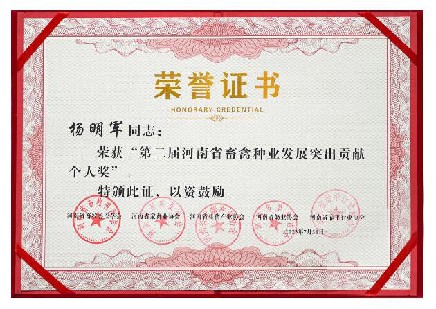 天成鴿業(yè)董事長楊明軍榮獲“河南省畜禽種業(yè)發(fā)展突出貢獻(xiàn)個人獎”