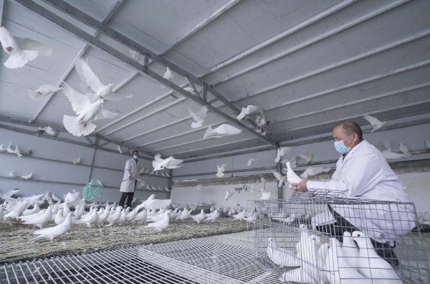 近日,在新疆巴音郭楞蒙古自治州和靜縣額勒再特烏魯鄉(xiāng)察汗烏蘇村,肉鴿養(yǎng)殖繁育基地的工作人員正在標準化養(yǎng)殖圈舍內(nèi)忙碌。該養(yǎng)殖場已孵化出今年第一批鴿苗共3000羽,預(yù)計4月