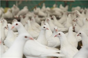 白羽王鴿又稱白王鴿、白玉鴿、白大王鴿等是常見的肉鴿品種,其全身羽毛潔白,緊湊,頭部較圓,前額突出喙細(xì)呈肉紅色,鼻瘤很小,眼大有神,胸寬而圓,北寬尾長(zhǎng)且平直。尾羽略上翹,體態(tài)豐