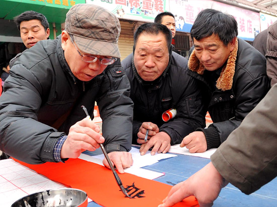 1月10日,河南省文聯(lián)的一名書法家為群眾書寫春聯(lián)