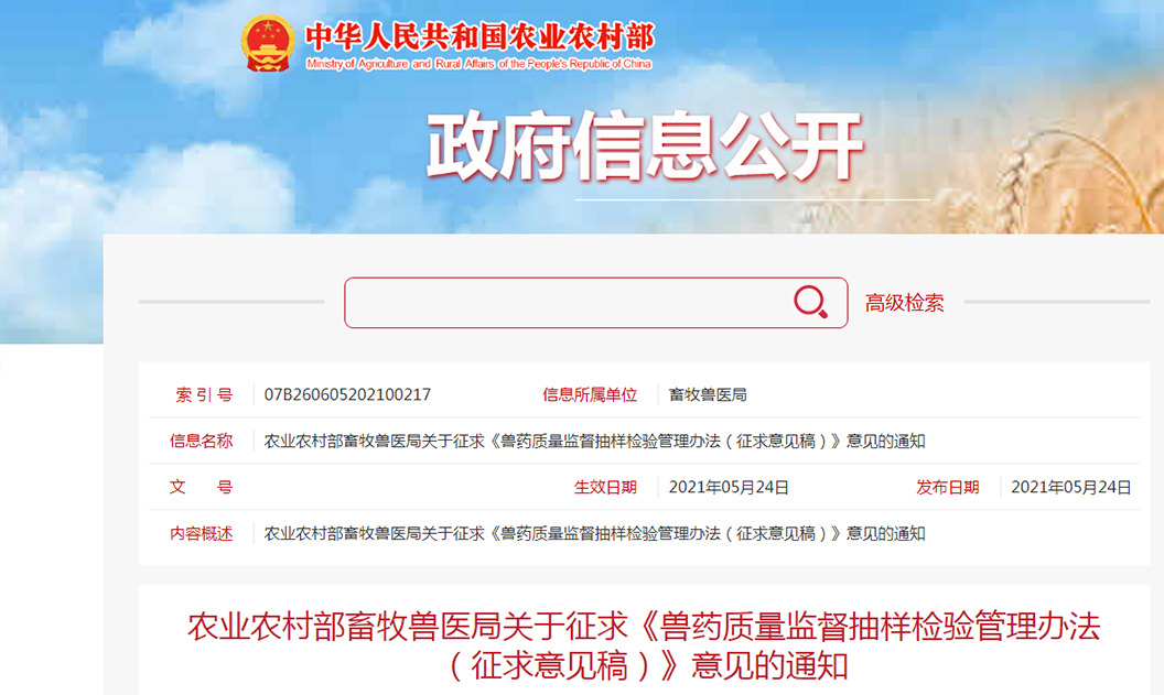農(nóng)業(yè)農(nóng)村部 | 《獸藥質(zhì)量監(jiān)督抽樣檢驗管理辦法(征求意見稿)》
