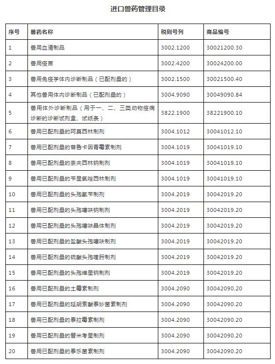 獸藥進(jìn)口單位進(jìn)口獸藥時(shí),應(yīng)向農(nóng)業(yè)農(nóng)村部或省級(jí)人民政府畜牧獸醫(yī)主管部門申請(qǐng)《進(jìn)口獸藥通關(guān)單》。進(jìn)口單位憑《進(jìn)口獸藥通關(guān)單》向海關(guān)辦理進(jìn)口手續(xù)。特此公告。 附件:進(jìn)口獸藥管理目錄