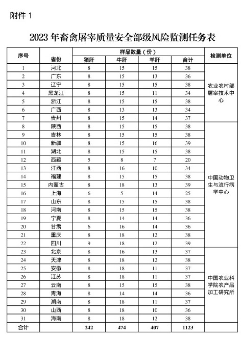 1. 2023年畜禽屠宰質量安全部級風險監(jiān)測任務表