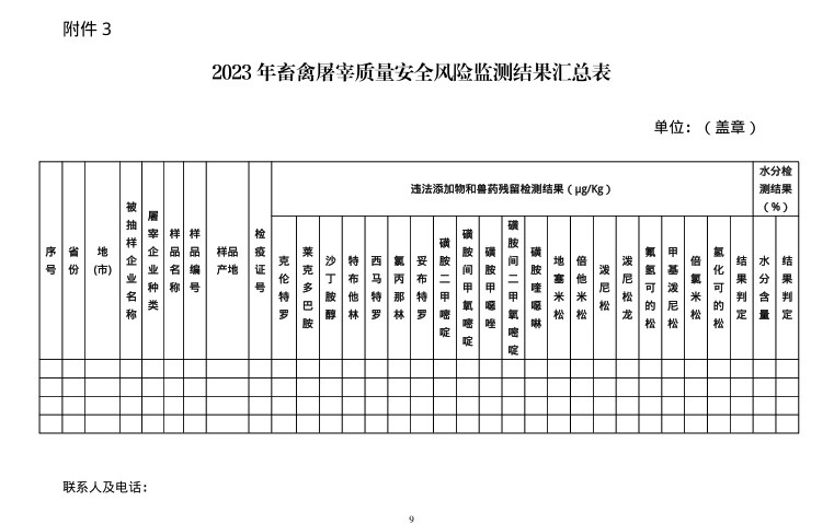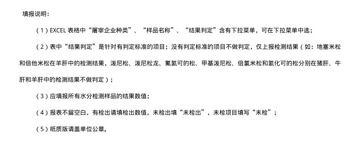 屠宰技術中心負責部級監(jiān)測和省級監(jiān)測數據的匯總與分析工作。部級監(jiān)測承檢機構和省級農業(yè)農村主管部門分別于6月25日、12月25日前將上半年、全年監(jiān)測結果匯總表(附件3)和監(jiān)測結果分析報告加蓋公章后報屠宰技術中心。