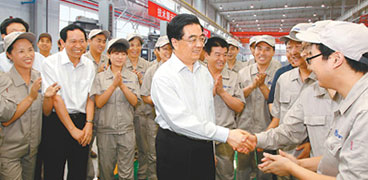 七月九日至十一日,中共中央總書記、國家主席、中央軍委主席胡錦濤在河南省考察工作。這是胡錦濤在洛陽軸承控股有限公司新洛軸工程現(xiàn)場同干部職工親切交談,希望企業(yè)一靠機