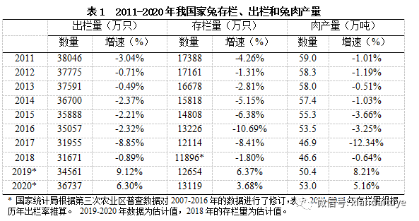 2011-2020年我國兔出欄、存欄和兔肉產(chǎn)量