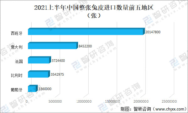 據(jù)中國海關(guān)數(shù)據(jù),2021上半年中國整張兔皮從西班牙地區(qū)進口數(shù)量最多為20147800張,其次是從意大利地區(qū)進口整張兔皮進口數(shù)量為8452200張。
