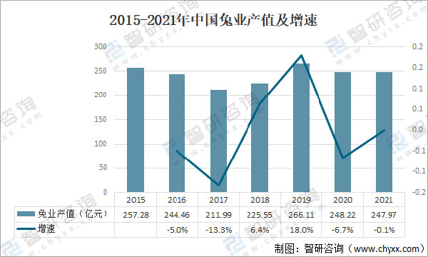 受供給側(cè)結(jié)構(gòu)性改革、環(huán)境保護政策等影響,我國兔業(yè)發(fā)展趨緩。2021年中國兔業(yè)產(chǎn)值約為247.97億元,同比下降0.1%。