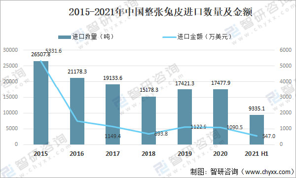 2015-2021年中國整張兔皮進口數(shù)量及金額