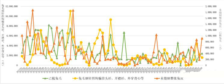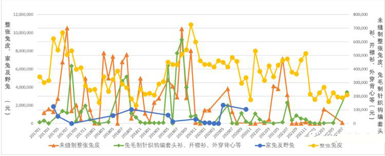 8月份整張兔皮進(jìn)口額為315.68萬(wàn)元,較上月上升10.81%;兔毛制針織鉤編套頭衫、開(kāi)襟衫、外穿背心等進(jìn)口額為22.87萬(wàn)元(圖7)。