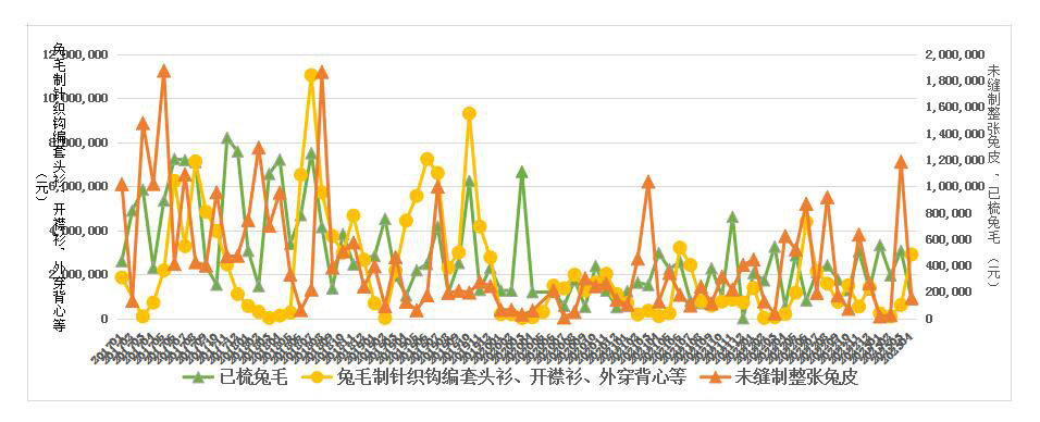2023年4月份整張兔皮進(jìn)口額為241.07萬(wàn)元,較上月增加39.88%;未縫制整張兔皮進(jìn)口額為0.84萬(wàn)元(見圖7)。
