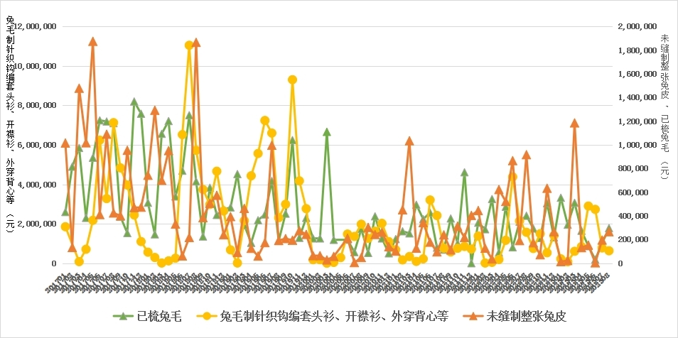 2023年8月份整張兔皮進口額為367.48萬元,較上月上升24.20%;未縫制整張兔皮進口額為3960元,較上月下降7.26%(見圖7)。