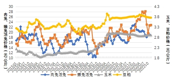 圖1 2011年—2022年兔及兔產(chǎn)品平均價格走勢 (右坐標為兔毛價格)