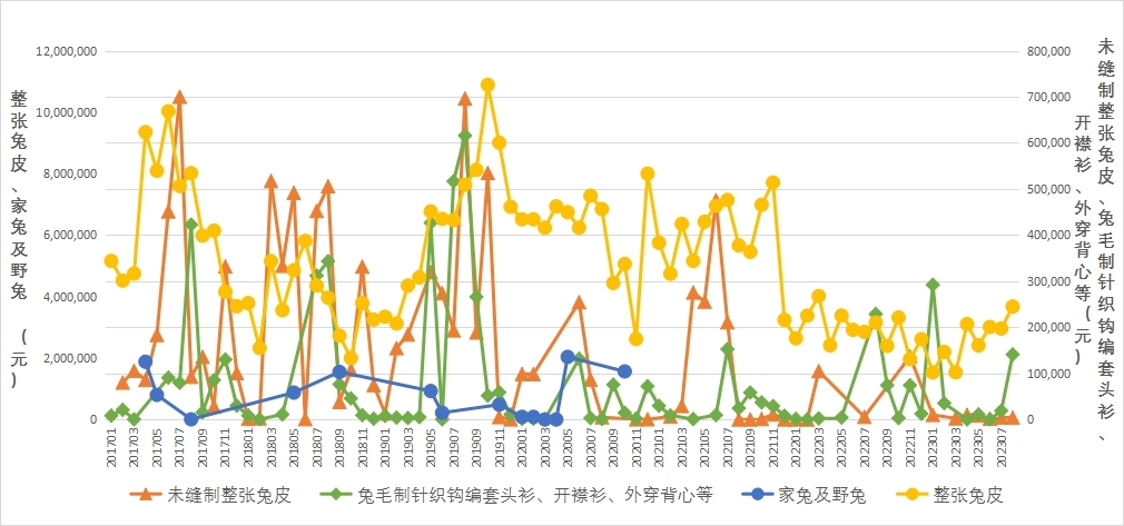 圖6 2017年1月-2023年8月其他兔產(chǎn)品出口額走勢