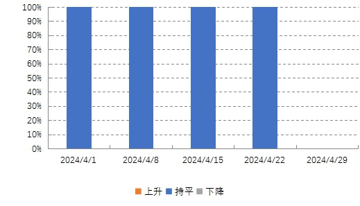 通過對中間環(huán)節(jié)集散地的價格進(jìn)行監(jiān)測,與2024年3月份相比,2024年4月份中除第四周數(shù)據(jù)缺失外,其余每一周的銷售情況都為100%持平(見圖3)。