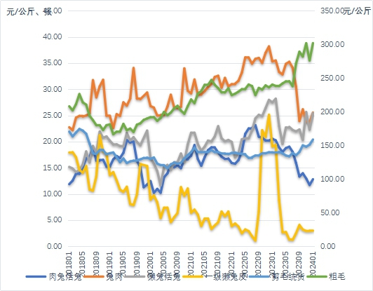 圖2 2018年1月-2024年4月兔及兔產(chǎn)品價格走勢(右坐標(biāo)為兔毛價格)