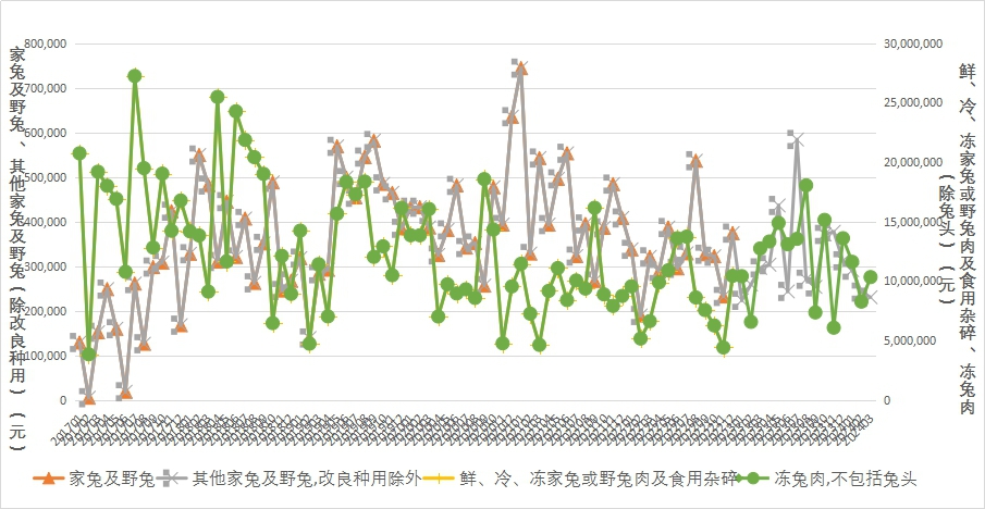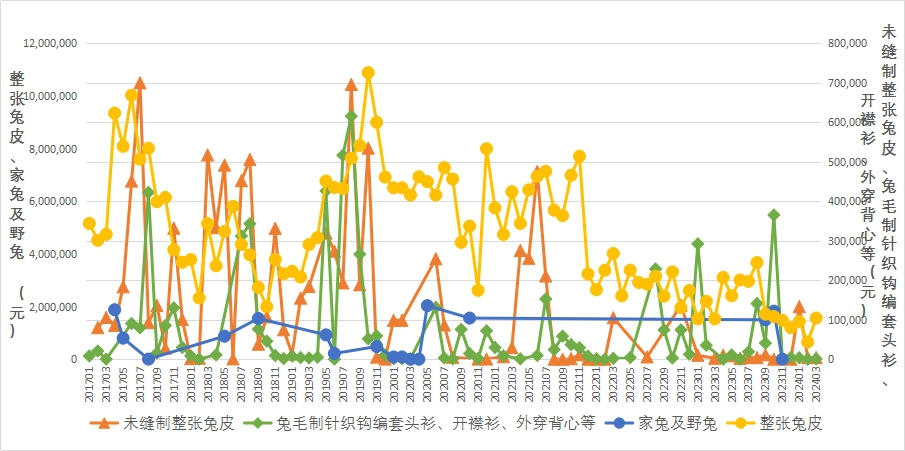 圖6 2017年1月-2024年3月其他兔產(chǎn)品出口額走勢