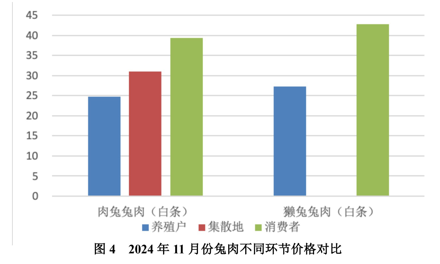 2024 年 11 月份養(yǎng)殖戶的肉兔兔肉銷售價(jià)格、中間商的集散價(jià)格和超市的零售價(jià)格分別為 24.74 元/公斤、31.03 元/公斤、39.34 元/公斤。11 月份集散地肉兔兔肉價(jià)格比養(yǎng)殖戶銷售的兔肉價(jià)格高 25.45%,超市消費(fèi)價(jià)格比集散地的兔肉價(jià)格高 26.77%,比養(yǎng)殖戶銷售的兔肉價(jià)格高 59.03%。養(yǎng)殖戶的獺兔兔肉銷售價(jià)格和超市的零售價(jià)格分別為 27.23 元/公斤、42.75 元/公斤,超市的獺兔兔肉價(jià)格比養(yǎng)殖戶銷售的兔肉價(jià)格高 57%。與上月相比,雖然養(yǎng)殖戶和集散地的銷售價(jià)格下降,但消費(fèi)者從超市購買兔肉的價(jià)格略有上升。