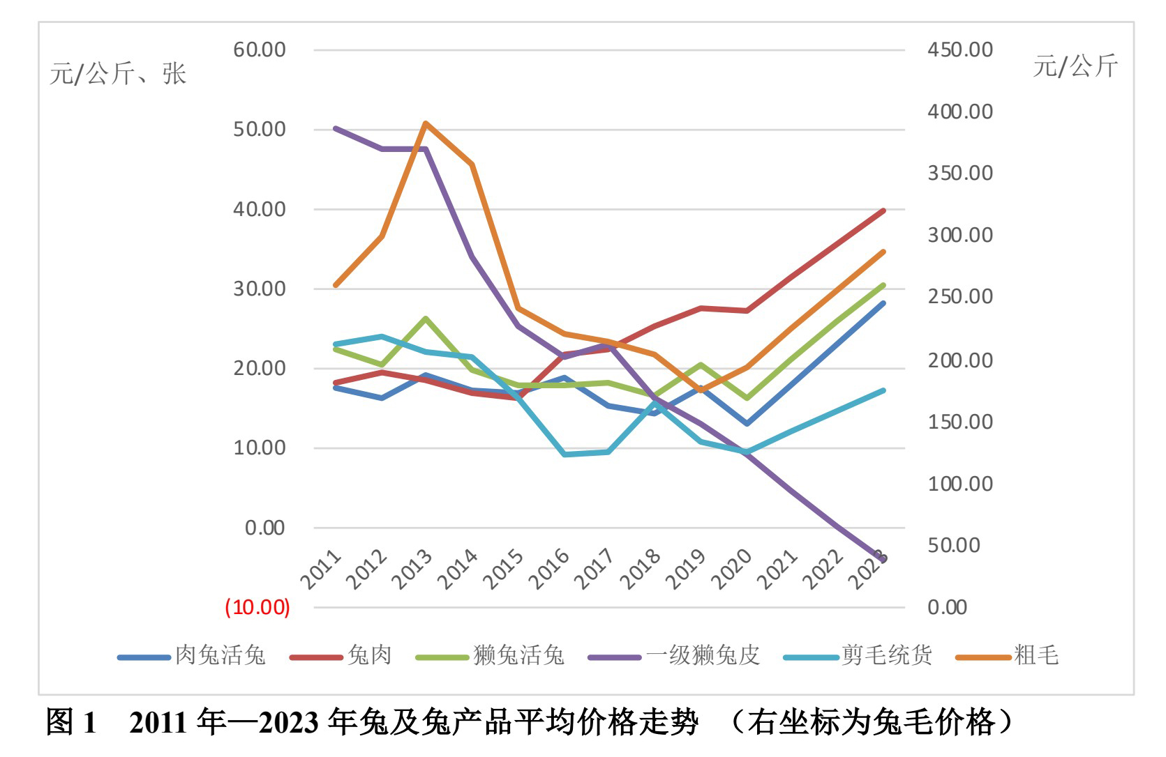 關(guān)注兔產(chǎn)品價(jià)格長期走勢。圖1為 2011年—2023年兔及兔產(chǎn)品年平均價(jià)格走勢,肉兔活兔和獺兔活兔價(jià)格呈上升趨勢,且價(jià)格波動情況類似,兔肉價(jià)格總體也呈上升趨勢;兔毛產(chǎn)品中,剪毛統(tǒng)貨價(jià)格波動幅度較大,近三年呈上升趨勢,粗毛價(jià)格在經(jīng)歷一段時間的下降后開始回升,近五年不斷上升;一級獺兔皮價(jià)格總體呈下降趨勢。