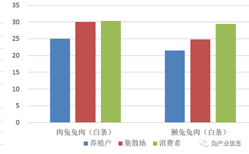 6月份肉兔兔肉的養(yǎng)殖戶銷售價格、中間商的集散價格和超市的零售價格分別為:25.00元/公斤、30.00元/公斤、30.34元/公斤。一般來說,零售端超市和中間商的肉兔兔肉價格要比產(chǎn)地的養(yǎng)殖戶銷售價格高,反映了產(chǎn)品在三個環(huán)節(jié)中的不斷增值。集散地肉兔兔肉價格比養(yǎng)殖戶銷售的價格高出20.02%,超市消費(fèi)價格比養(yǎng)殖戶銷售的兔肉價格高21.28%,比中間的集散地批發(fā)價格高1.13%。養(yǎng)殖戶的獺兔兔肉銷售價格、中間商的集散價格和超市的零售價格分別為:21.53元/公斤、24.79元/公斤、29.40元/公斤。同上,一般零售端超市和中間商的懶兔兔肉價格也會高于產(chǎn)地養(yǎng)殖戶的銷售價格,也表現(xiàn)出了產(chǎn)品在三個環(huán)節(jié)中的不斷增值。集散地獺兔兔肉價格比養(yǎng)殖戶銷售的價格高出15.13%,超市消費(fèi)價格比養(yǎng)殖戶銷售的兔肉價格高36.54%,比中間的集散地批發(fā)價格高18.60%。