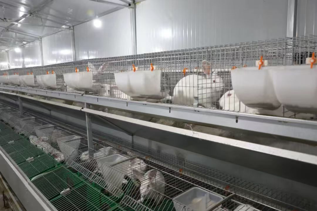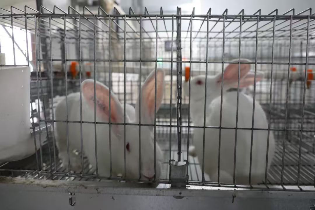 走進(jìn)養(yǎng)殖基地,一排排整齊的兔舍映入眼簾?;\內(nèi)一只只雪白的、毛茸茸的兔子圓滾可愛,有的在悠閑地進(jìn)食,有的在瞇眼打盹,有的興奮地豎起耳朵四下張望,工作人員正熟練地加食、加水、清理糞便。