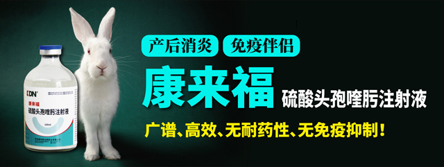 母兔輸精/產(chǎn)后第一時(shí)間,注射[康來福]0.5ml/只,有效預(yù)防母兔產(chǎn)后炎癥、仔兔“黃尿病”,提升母免受孕及產(chǎn)仔成活率;同時(shí)預(yù)防兔群因大腸桿菌、巴氏桿菌等病原菌引起的呼吸道疾病。