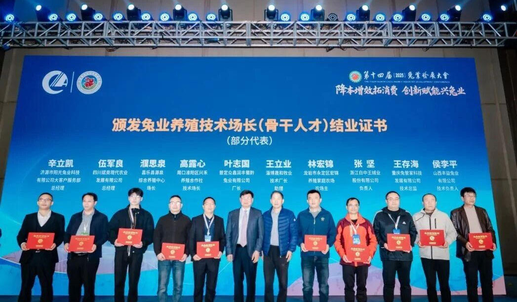 中國畜牧業(yè)協(xié)會沙玉圣秘書長、中國畜牧業(yè)協(xié)會兔業(yè)技術(shù)指導(dǎo)專家組長谷子林老師為兔業(yè)養(yǎng)殖技術(shù)場長(骨干人才)專項培訓(xùn)計劃的優(yōu)秀學(xué)員代表頒發(fā)結(jié)業(yè)證書。