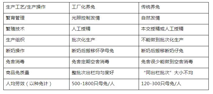 工廠化養(yǎng)兔模式與傳統(tǒng)養(yǎng)兔模式比較如下表:
