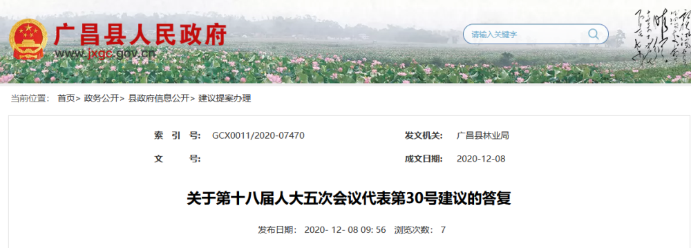 12月8日,廣昌縣林業(yè)局通過廣昌縣人民政府官網(wǎng)公布了《關于第十八屆人大五次會議代表第30號建議的答復》。