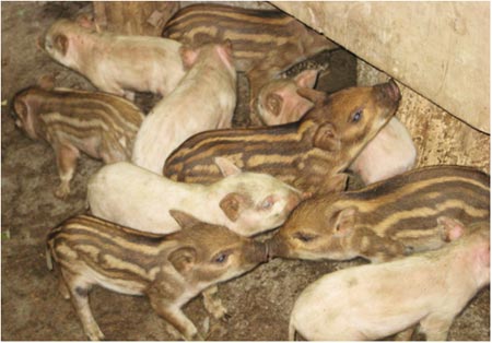記者了解得知,安其洪今年36歲,外出務(wù)工8年,2005年回家后將在外所學(xué)技術(shù)運用于實際,專心探索特種養(yǎng)殖。經(jīng)過近三年的努力,在利用野生公豬與本地良種母豬進(jìn)行雜交的試驗中初見成效,于今年6月底和7月初分別由兩頭母豬繁育出22頭(每頭母豬繁育11頭)“野豬寶寶”?,F(xiàn)在兩頭良種母豬又懷上了豬寶寶。